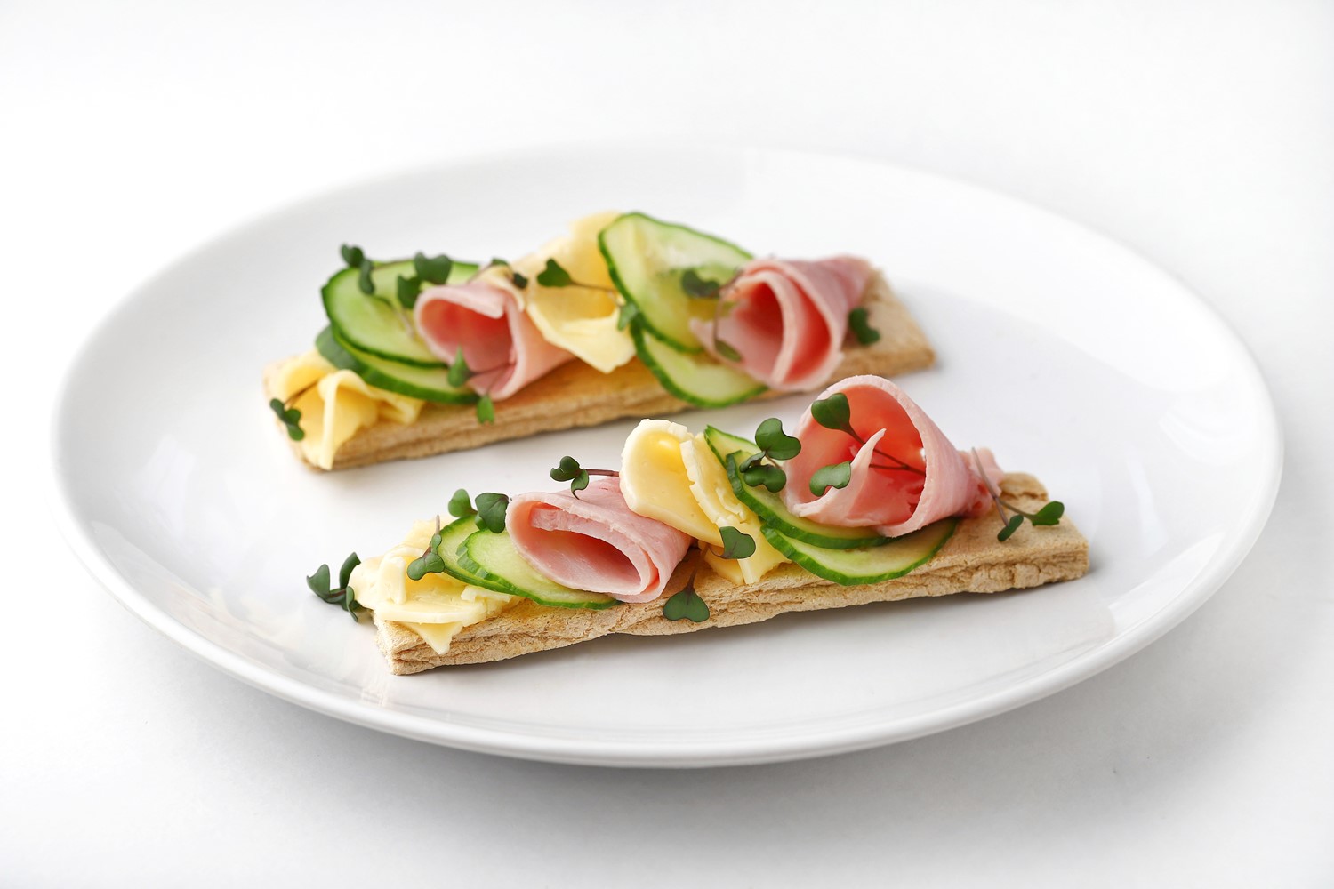 Все ингредиенты нарезать тонкими ломтиками и поочередно выложить на хлебец.